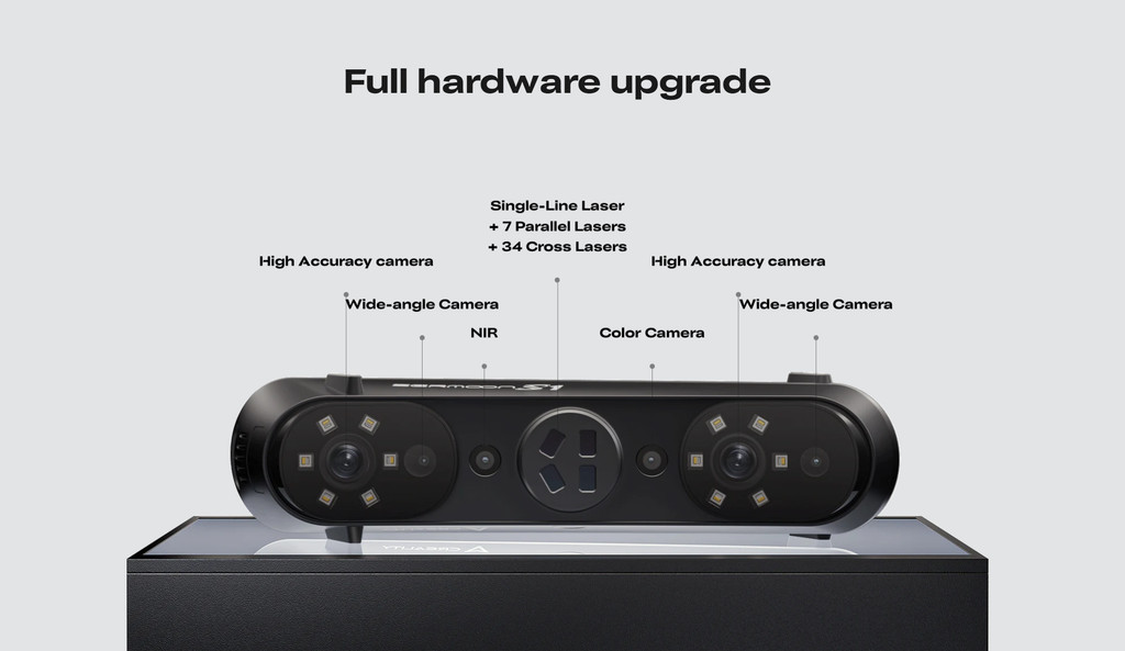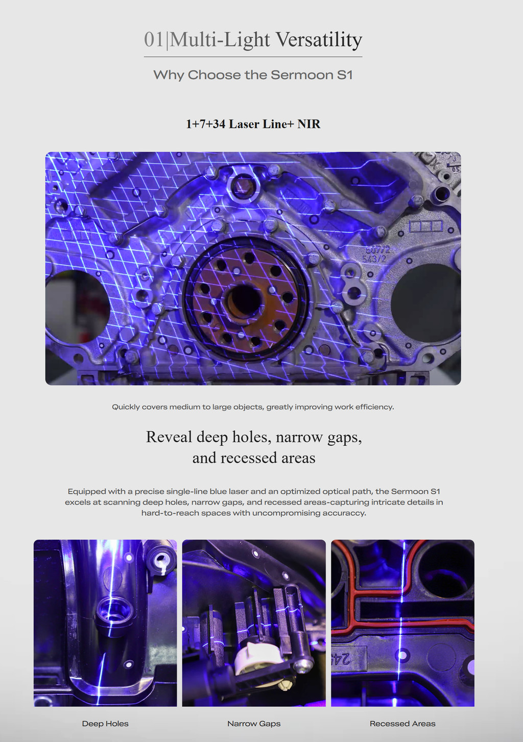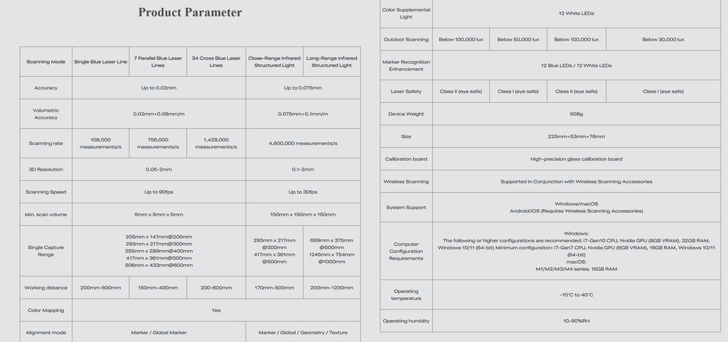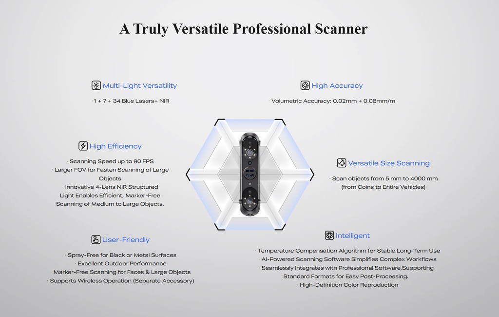 • Uses a combination of blue laser lines (single, 7 parallel, and 34 cross lines) plus NIR structured light for capturing both fine detail and broad surfaces, making it versatile across many object types and sizes.