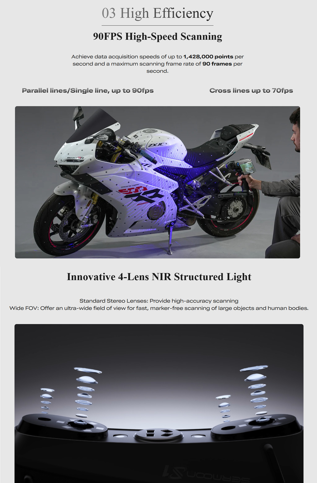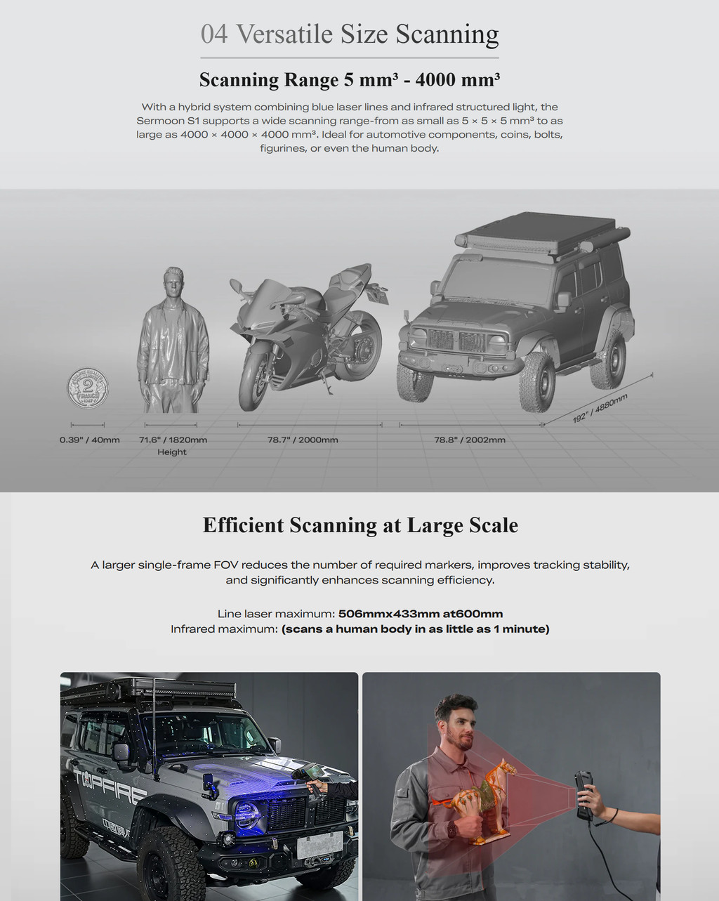 • Capable of scanning objects from as small as 5 × 5 × 5 mm up to 4000 × 4000 × 4000 mm, covering everything from intricate parts to full-size vehicles.