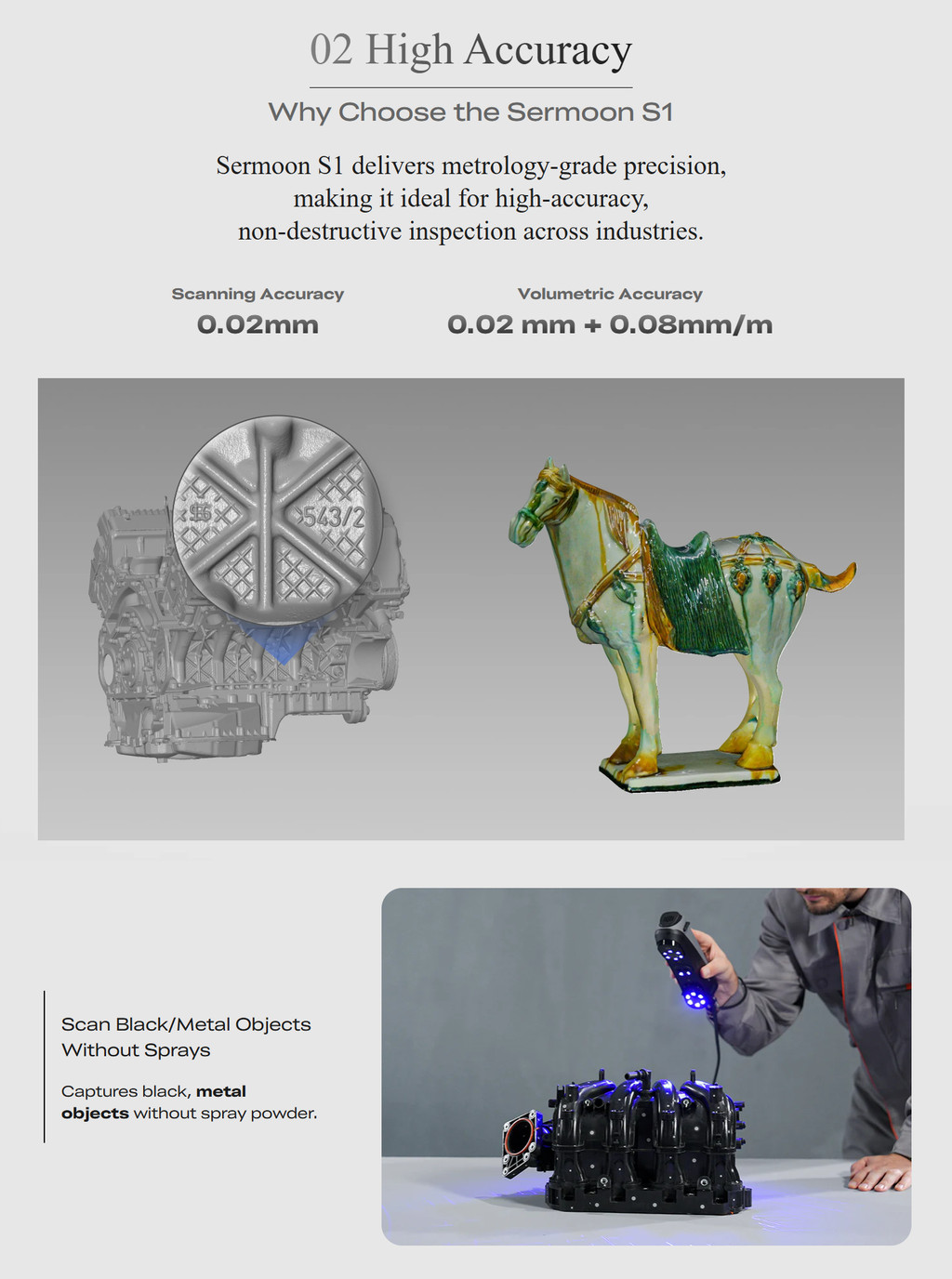 • Delivers metrology-grade scanning with up to 0.02 mm accuracy and 0.02 mm + 0.08 mm/m volumetric accuracy, suitable for engineering, inspection, and reverse-engineering tasks.