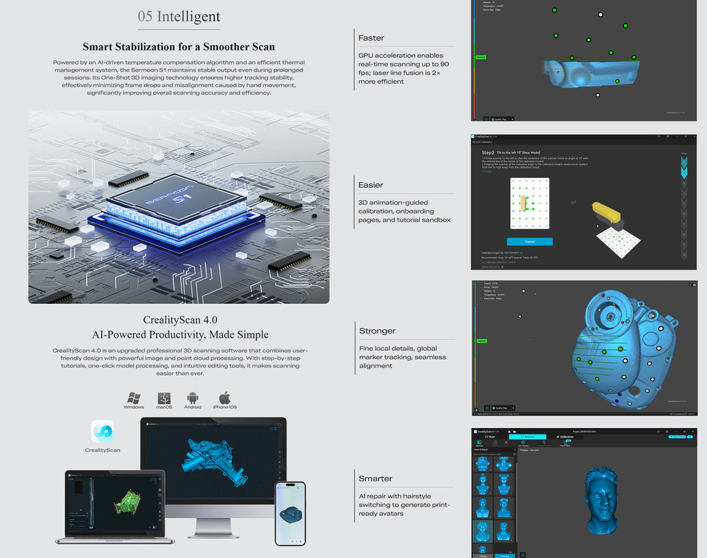 • Works with CrealityScan 4.0 software and supports Windows and macOS; wireless scanning is available with optional accessories.