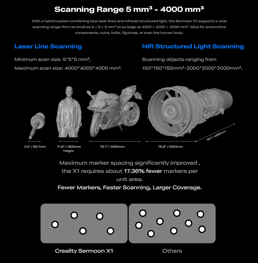 • Covers a full range from micro-objects (5 mm³) to large parts (4000 mm³).