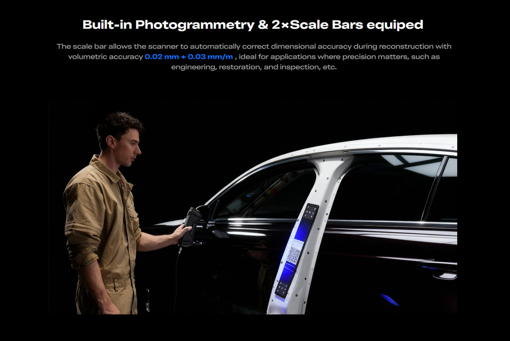 • Dual photogrammetry scale bars automatically correct dimensional accuracy for inspection-grade scanning.