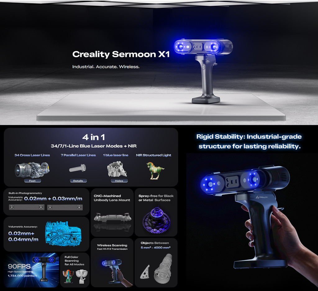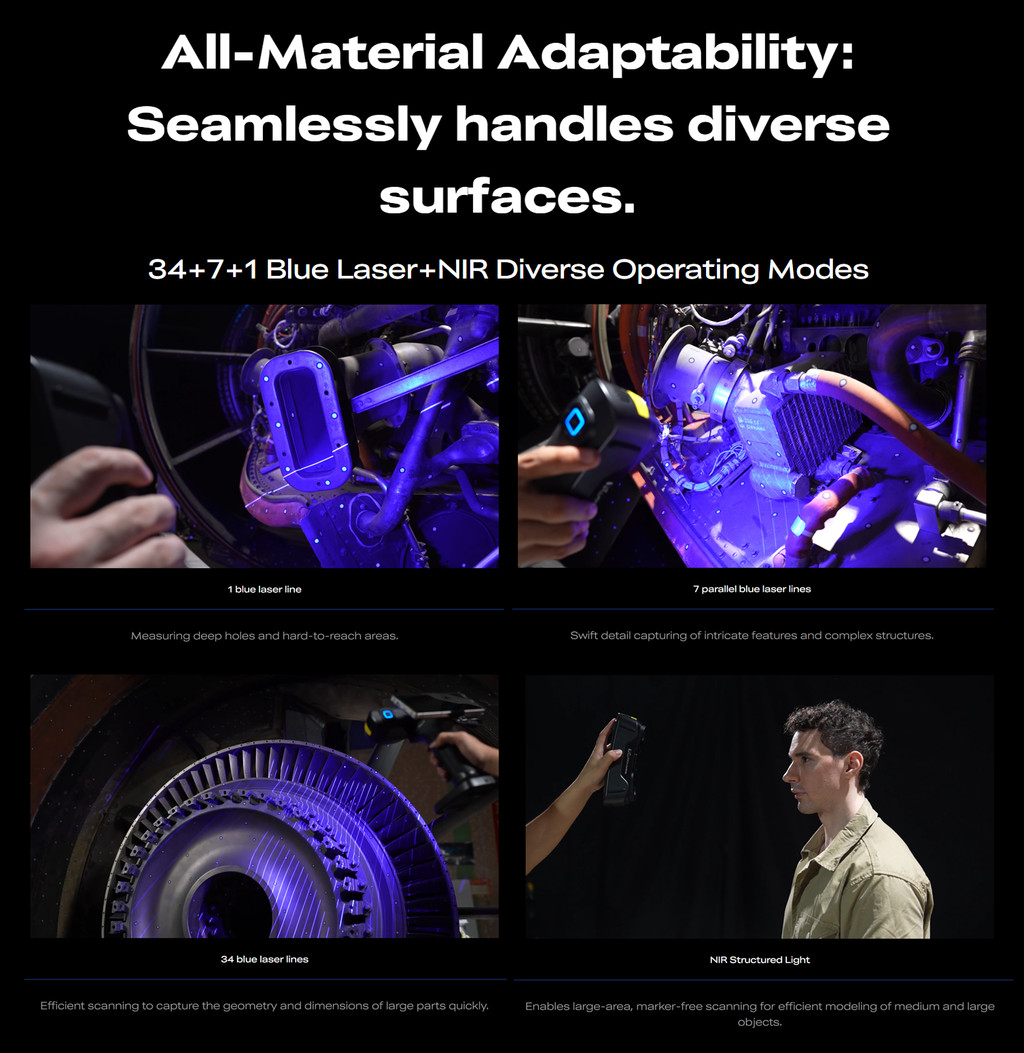 • Combines 34 cross-line lasers, 7 parallel lasers, and 1 single deep-hole laser with NIR structured light.