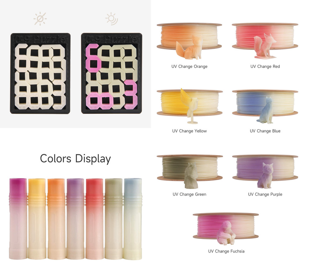 • Experience prints that change color automatically under UV or sunlight, shifting from a neutral tone to vivid hues in seconds. The effect is fully reversible, offering a fun dual-color visual that reacts to lighting conditions, ideal for art, cosplay, and decorative applications.
