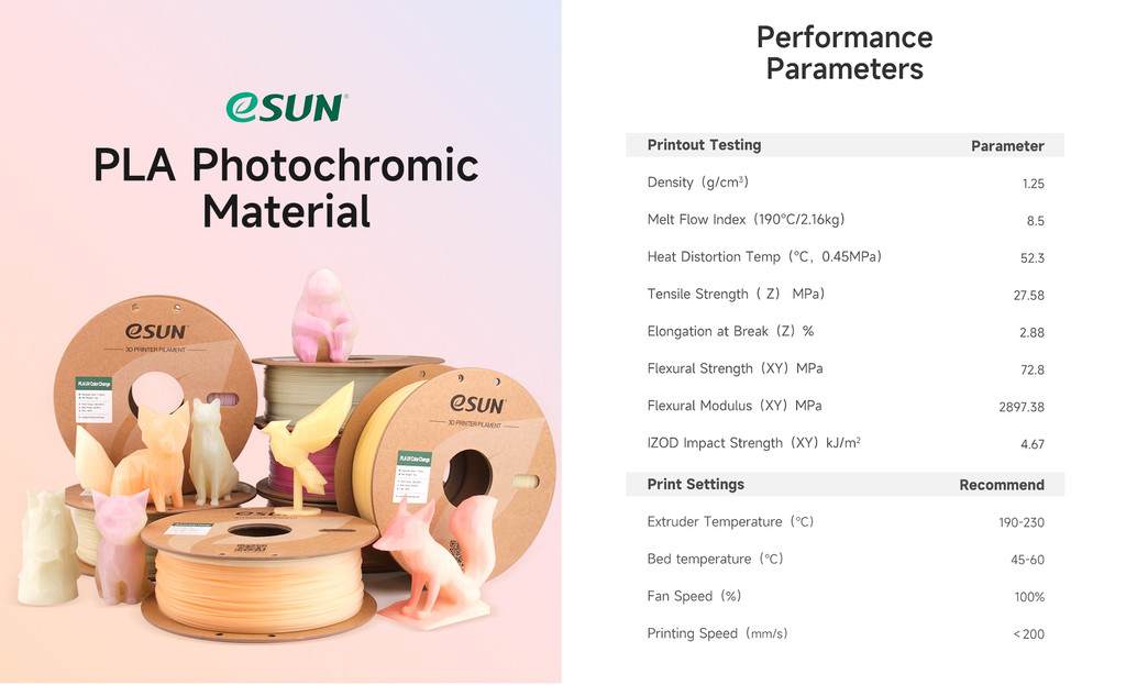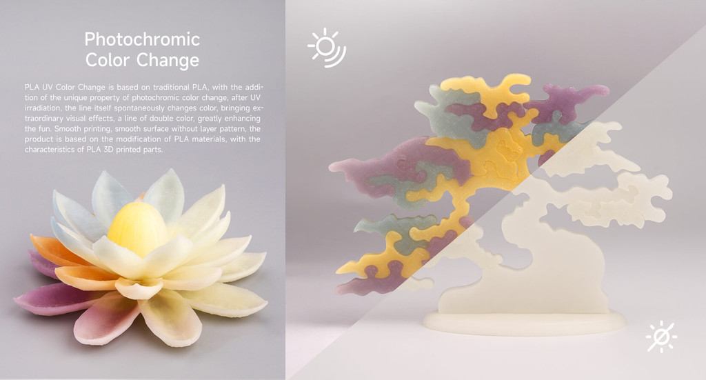 • Despite its artistic purpose, PLA-UV CC maintains moderate mechanical strength and stiffness, ensuring your prints are both visually dynamic and physically robust.