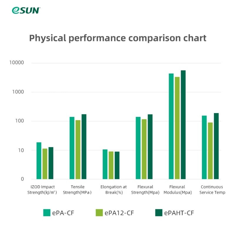It is a material developed by eSUN and LUVOCOM based on PA12, added with 15% carbon fiber, greatly enhances the strength, rigidity and toughness of nylon, and can be used as a substitute for metal in many occasions; low water absorption rate,less affected by humidity and temperature for printing parts’dimension; self-lubricating and wear-resistant properties make it suitable for printing gears; high temperature resistance, continuous using temperature of parts can reach 120℃, short-term use temperature can reach 160℃; low shrinkage, not easy to warp and crack during printing, and the printing surface is matte and delicate.