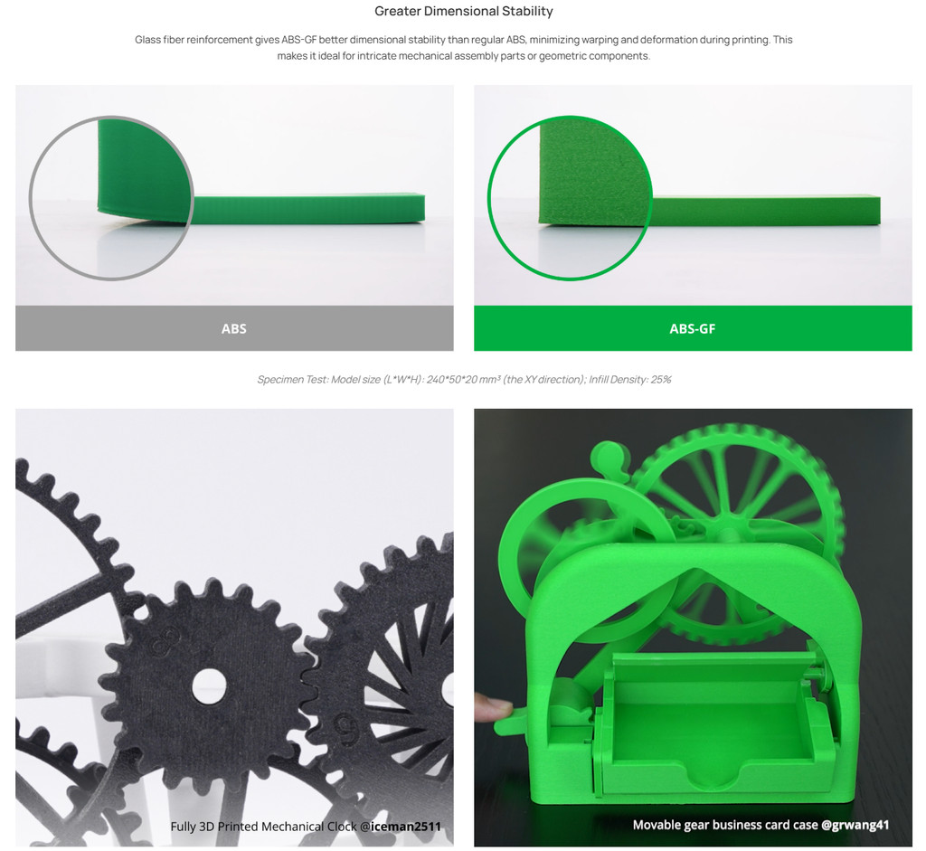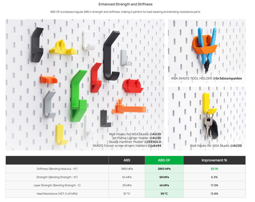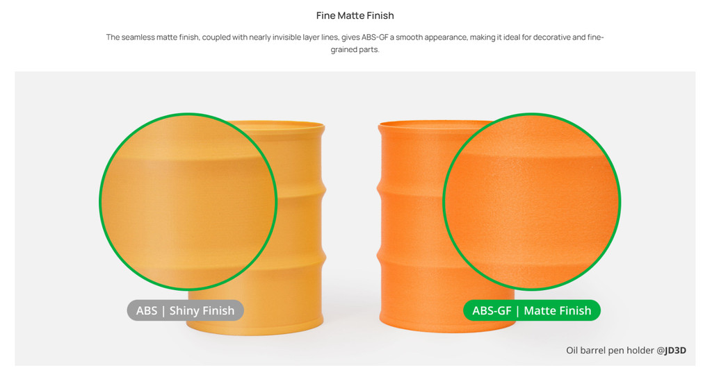 • Glass fiber boosts stiffness by over 50% and improves layer strength, making it ideal for load-bearing or high-stress parts.
