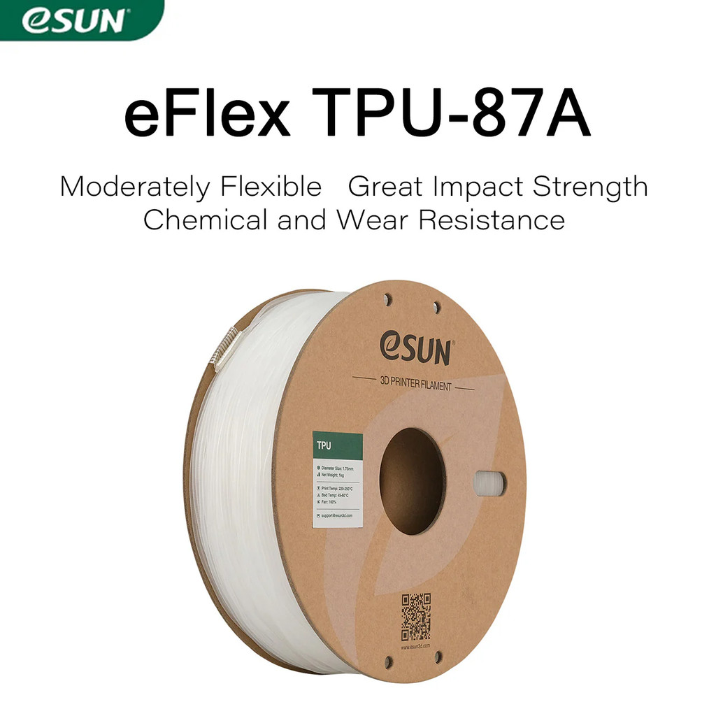 • eFlex (TPU-87A) strikes the perfect balance between softness and toughness, softer than TPU-95A but firmer than eLastic TPE-83A. It offers a smooth, rubber-like texture that bends and flexes while maintaining its shape, making it ideal for both functional and wearable applications.