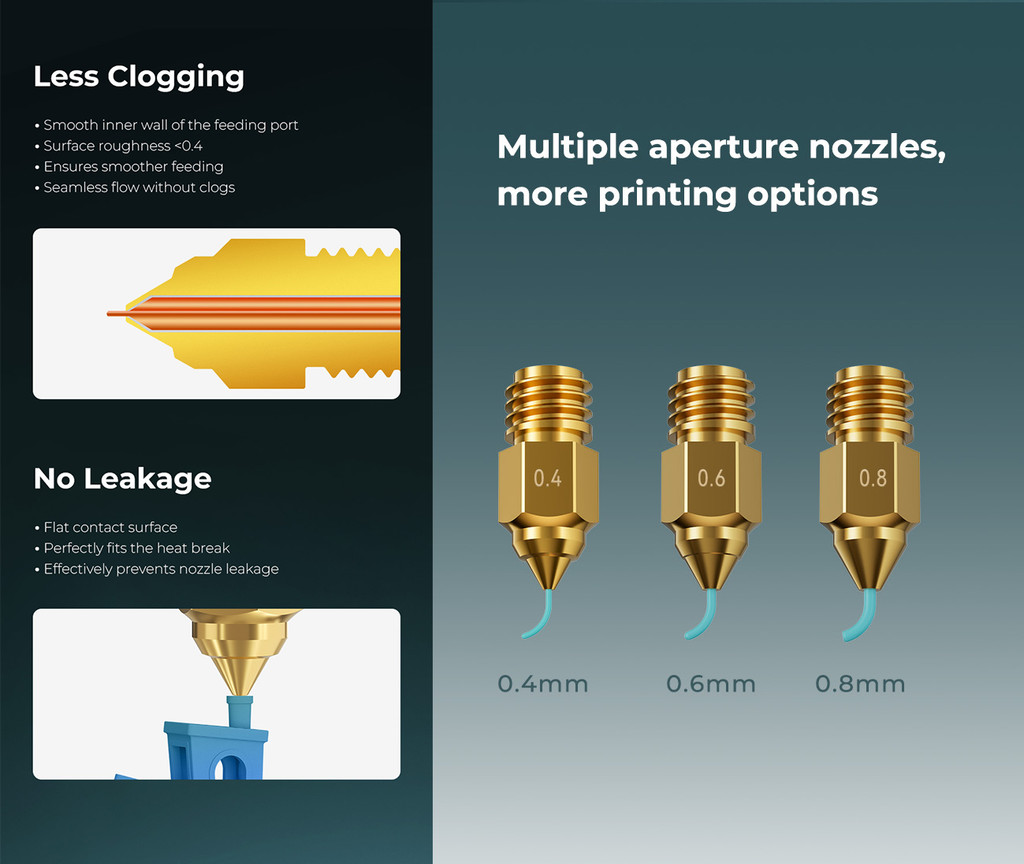 • Comes in standard 0.4 mm, with 0.6 mm and 0.8 mm available for faster printing and stronger parts