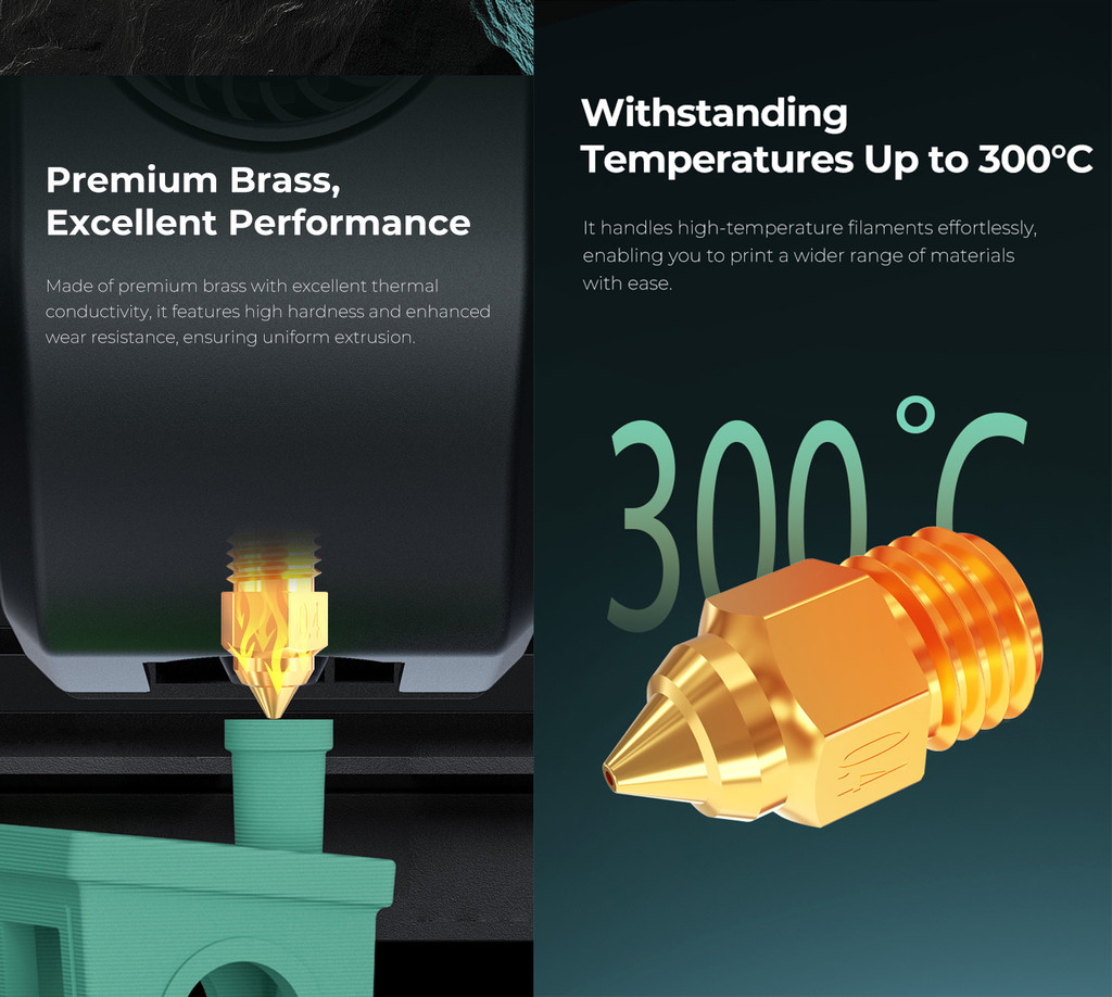 • Supports up to ~300 °C, enabling the use of a wide range of filaments.