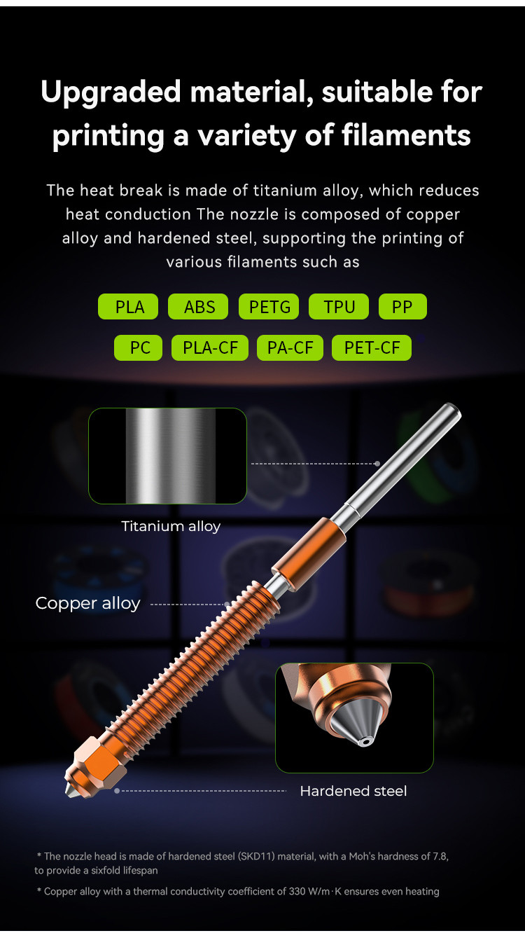 ๐ Upgraded Material: Constructed of copper alloy and hardened steel, it accommodates various filaments like PLA, ABS, PETG, TPU, PP, PC, PLA-CF, PA-CF, PET-CF