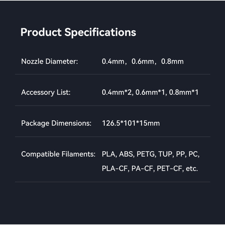 • Compatible Filaments: PLA, ABS, PETG, TPU, PP, PC, PLA-CF, PA-CF, PET-CF, High Abrasive Filaments