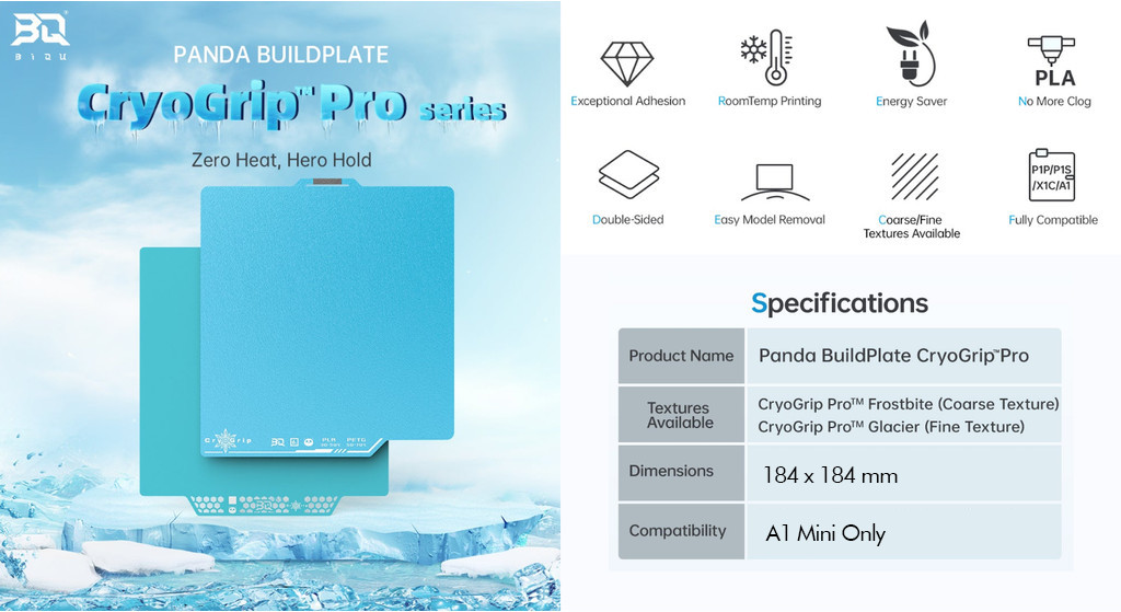 Optimized for Bambu Lab A1 Mini, the CryoGrip build plate offers reliable, draft-resistant printing for open models as well.