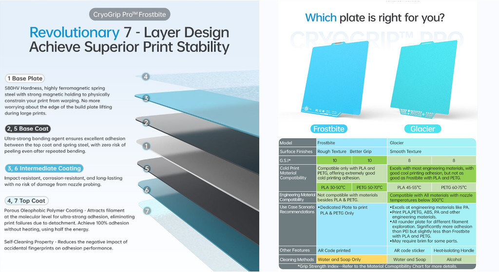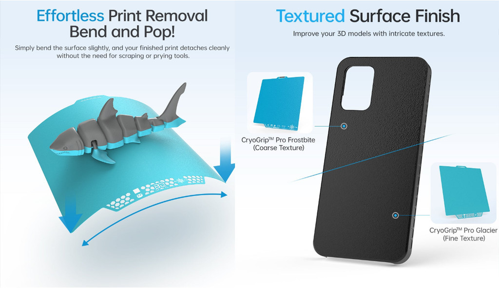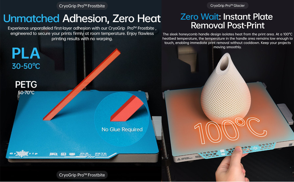 The CryoGrip build plate, crafted from a unique polymer, delivers stability and performance beyond traditional PEI solutions.