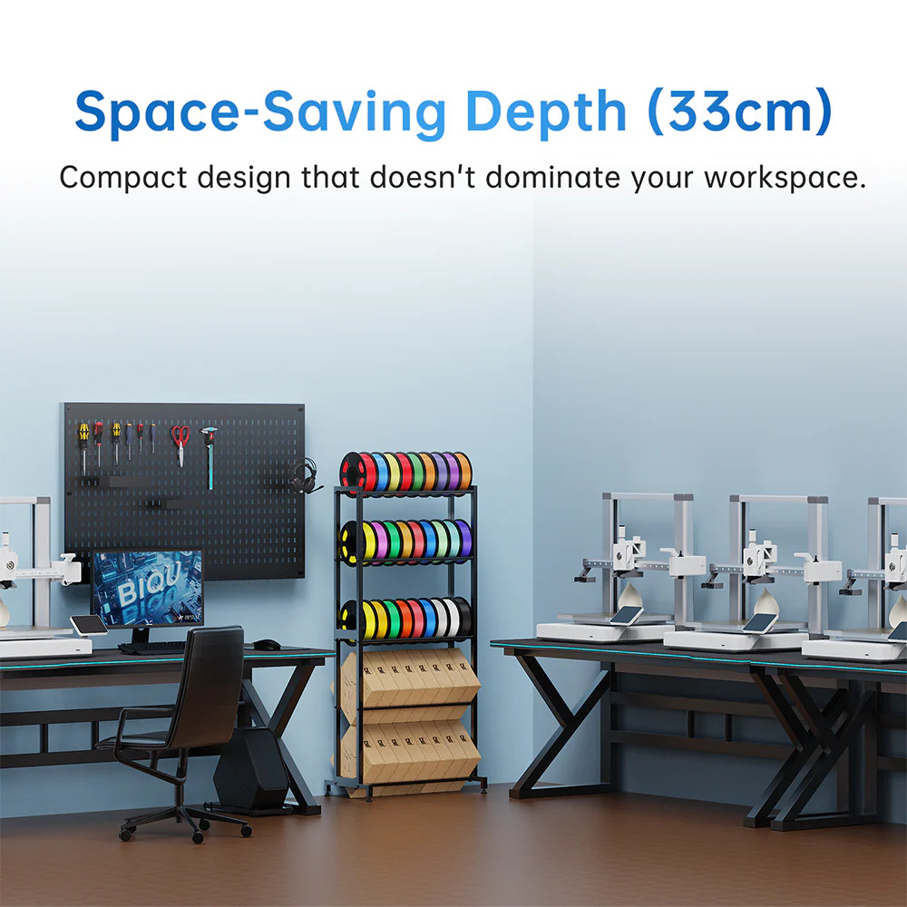 • Despite its large storage capacity, the Panda Feed Rack maintains a compact 33 cm depth, allowing it to fit neatly into tight workspaces or alongside other 3D printing equipment.