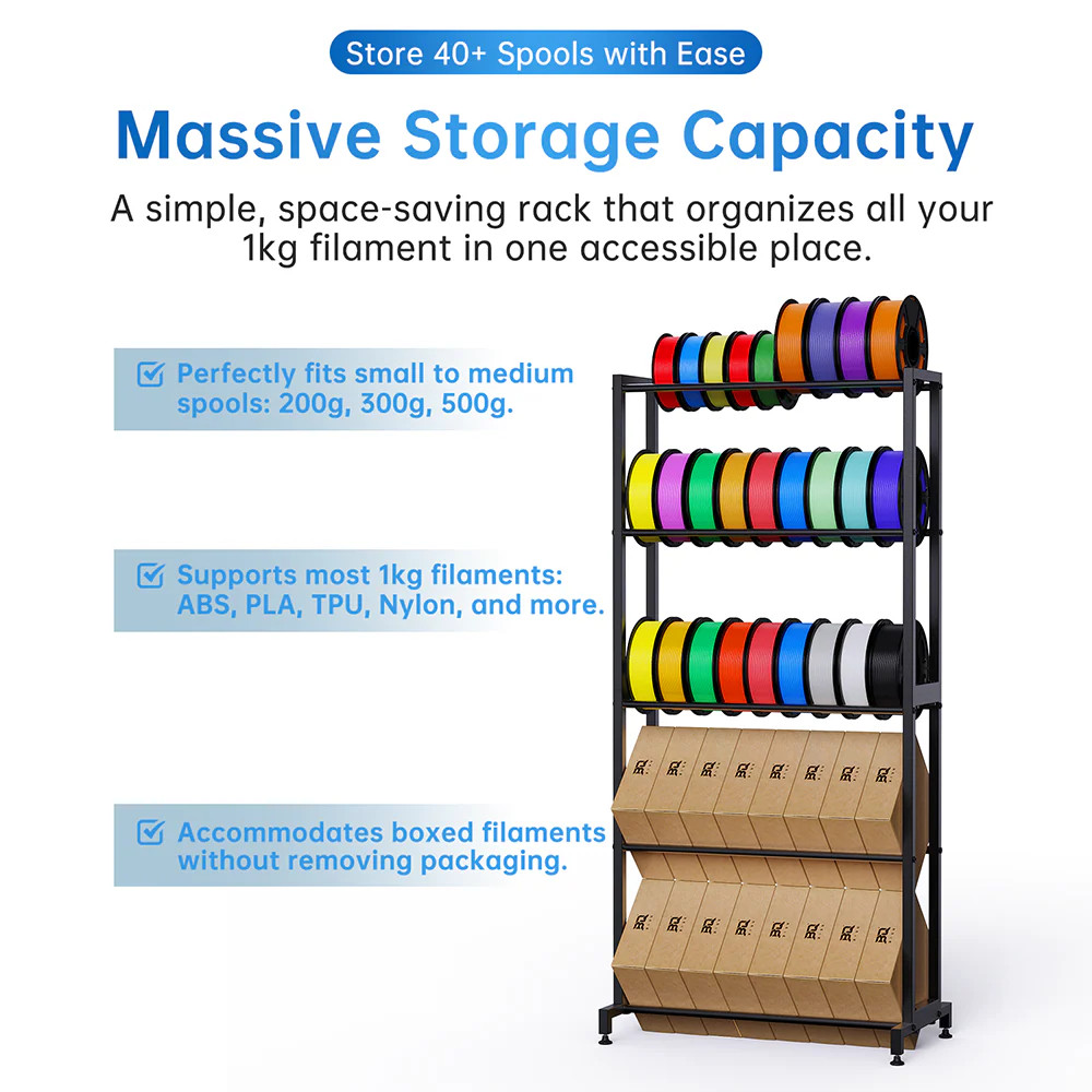 • Easily accommodates multiple 1 kg spools and smaller rolls (200 g – 500 g), including boxed filaments without removing packaging, perfect for organized multi-material setups.