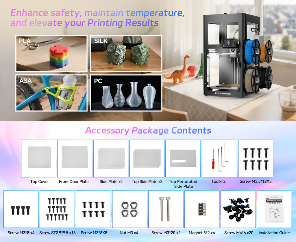 โข Specifically designed for the Flashforge AD5X, this enclosure offers an exact fit and easy installation. Its modular DIY structure lets you assemble or remove panels quickly without tools, ensuring convenience and flexibility in setup or maintenance.